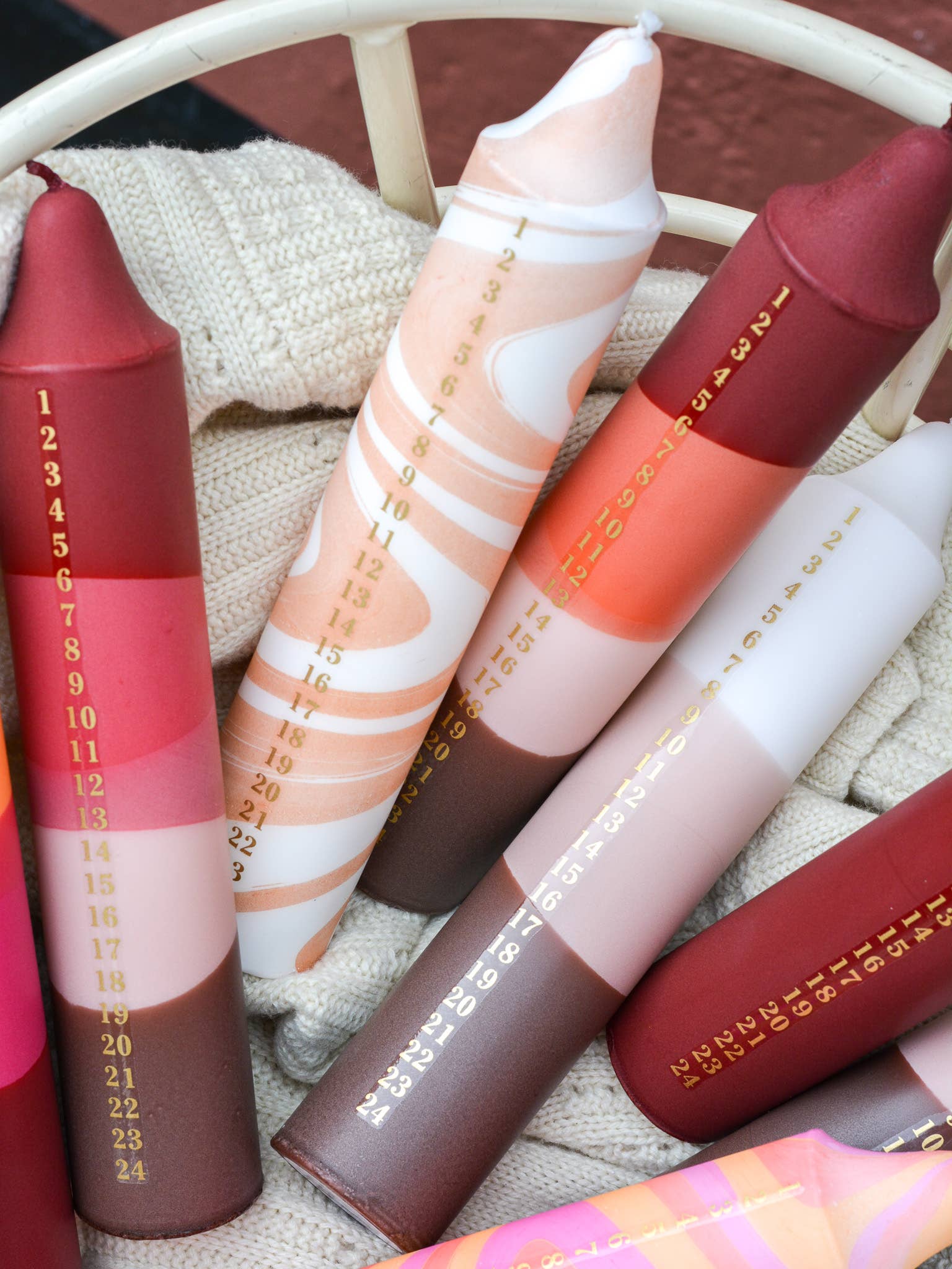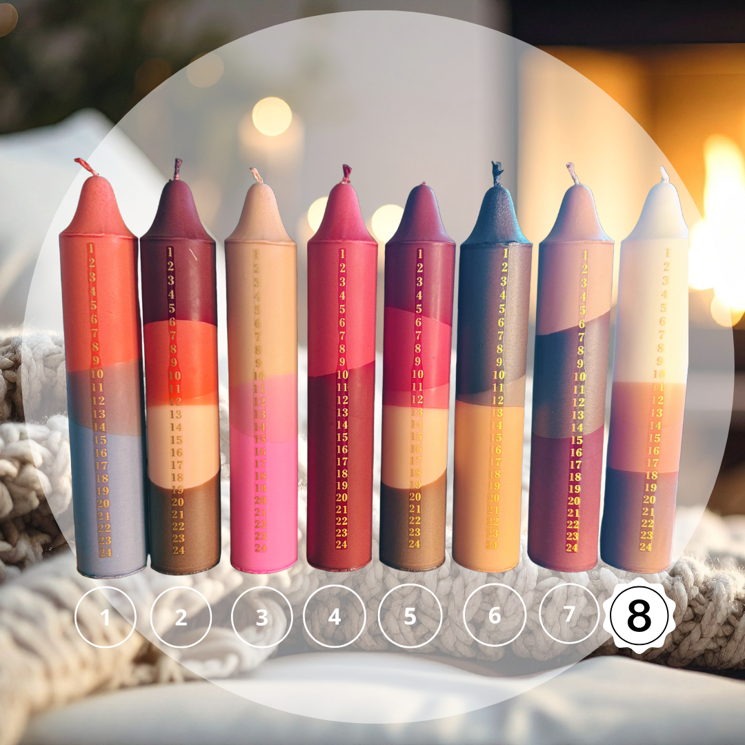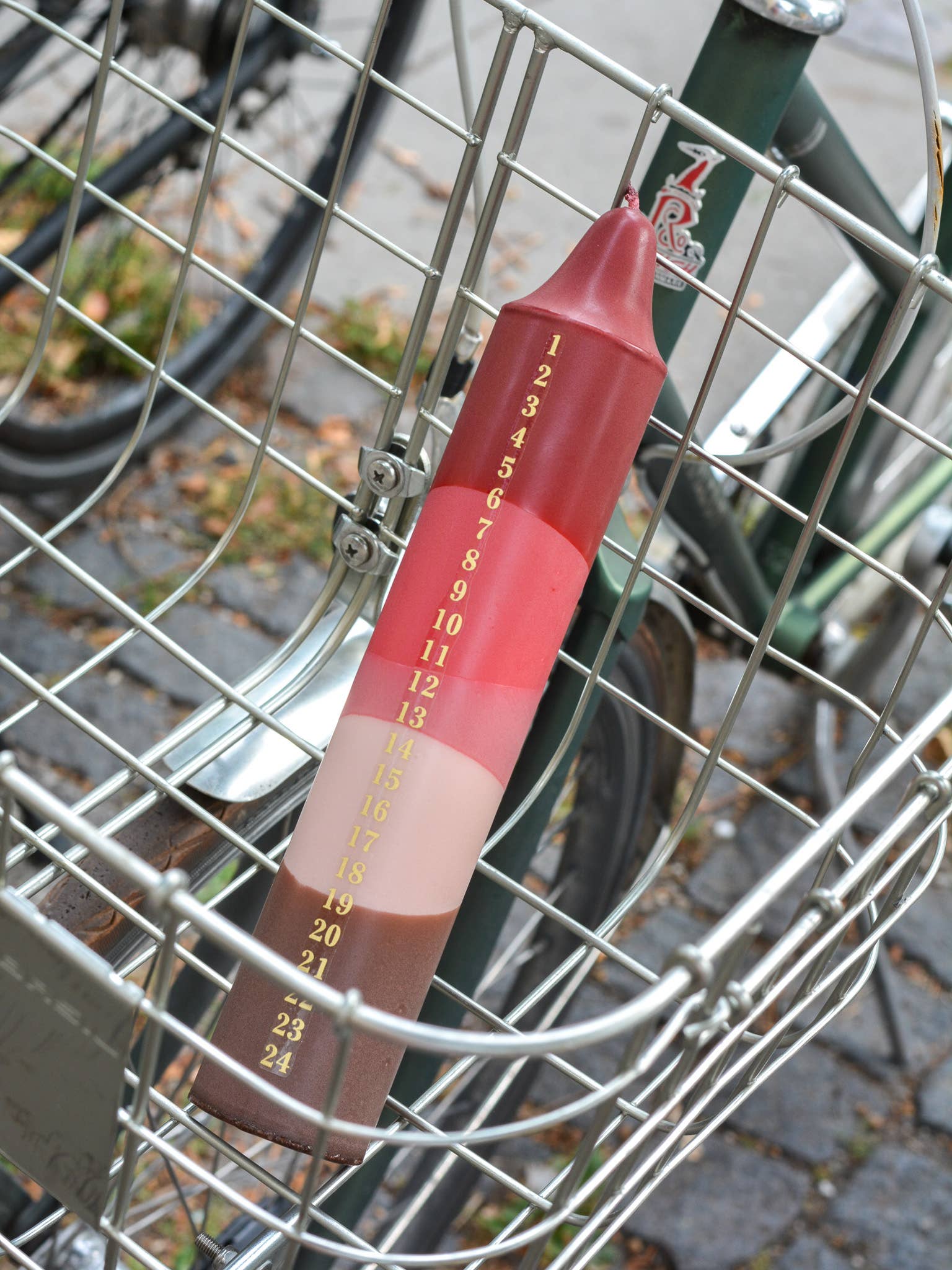 Jede Kerze ist mit sorgfältig markierten Zahlen versehen, die den Countdown bis Weihnachten darstellen.