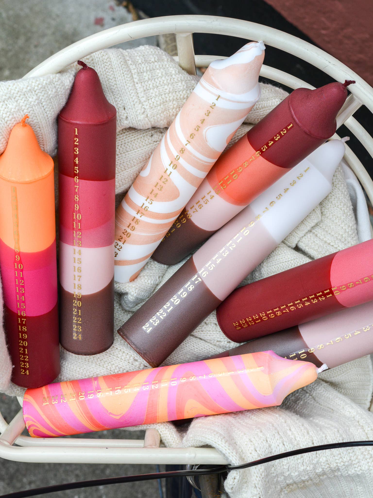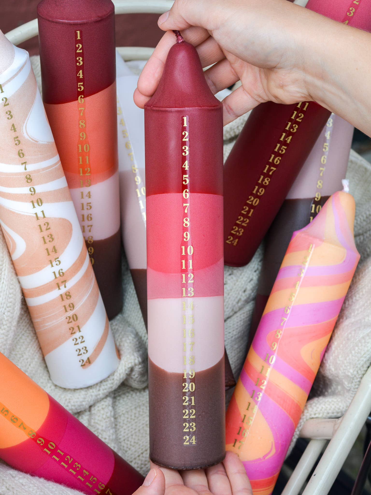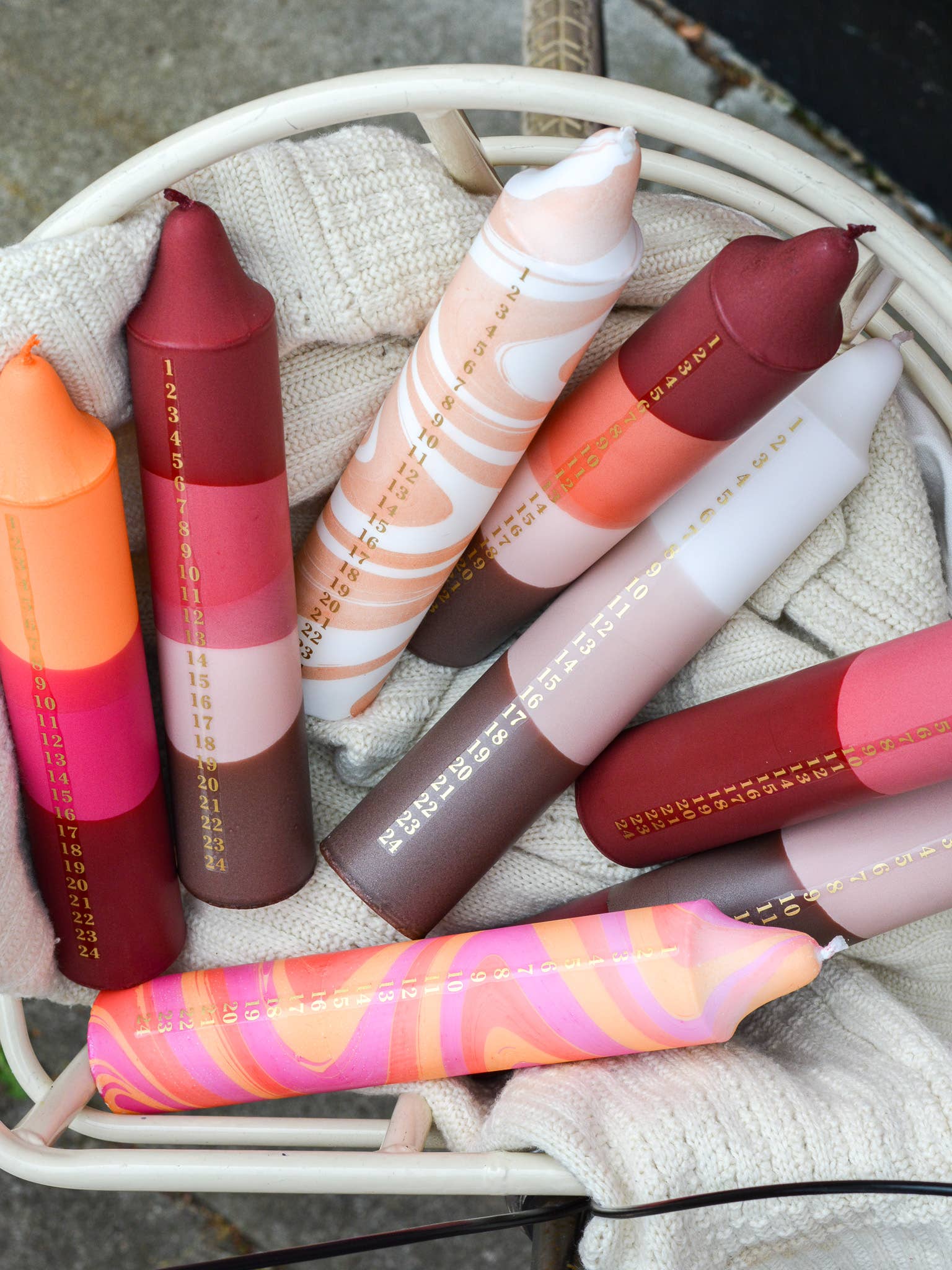 Jede Kerze ist mit sorgfältig markierten Zahlen versehen, die den Countdown bis Weihnachten darstellen.