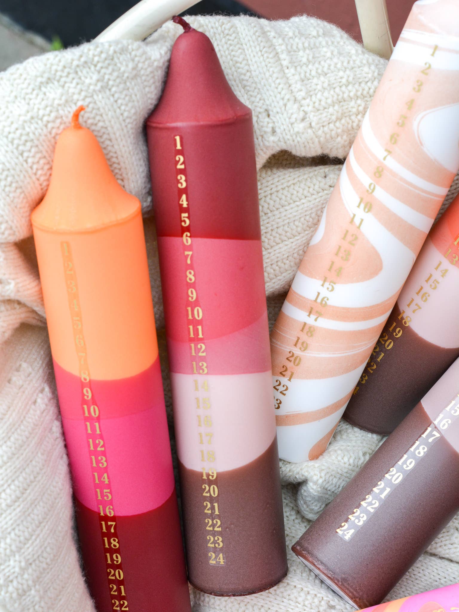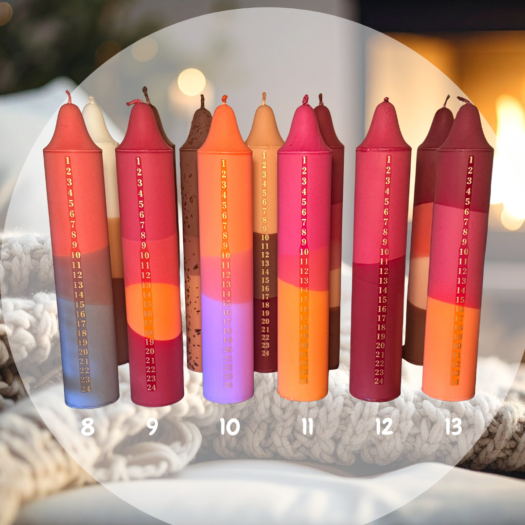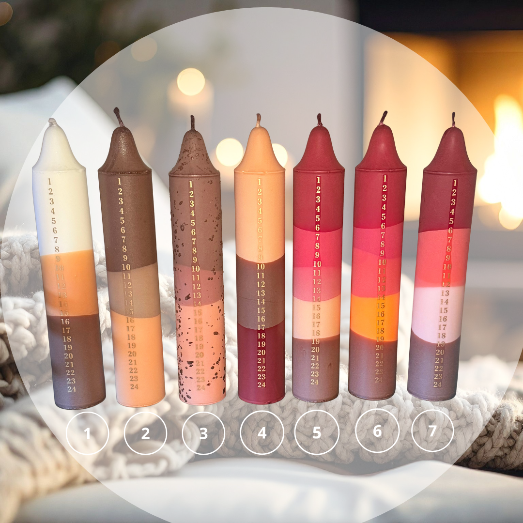Eine skandinavische, dänische Original-Adventskerze. Jede Kerze ist mit sorgfältig markierten Zahlen versehen, die den Countdown bis Weihnachten darstellen. Es ist ein freudiges Ritual, jeden Tag eine Zahl anzuzünden, um die Aufregung und Vorfreude auf die große Feier zu steigern.