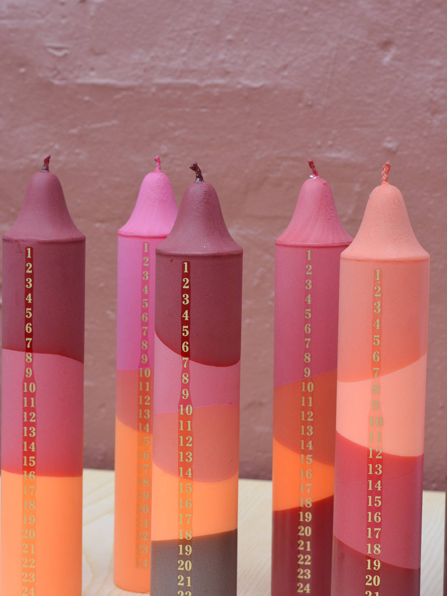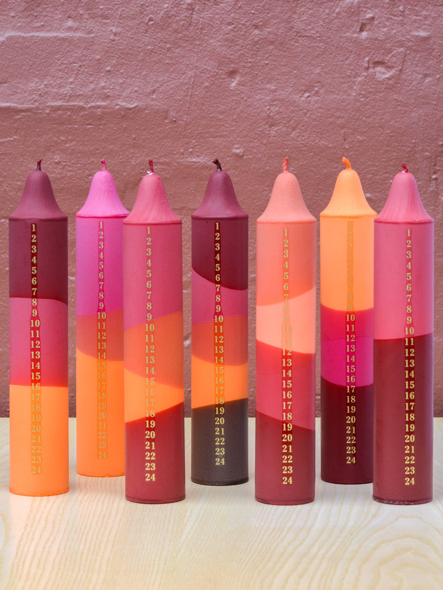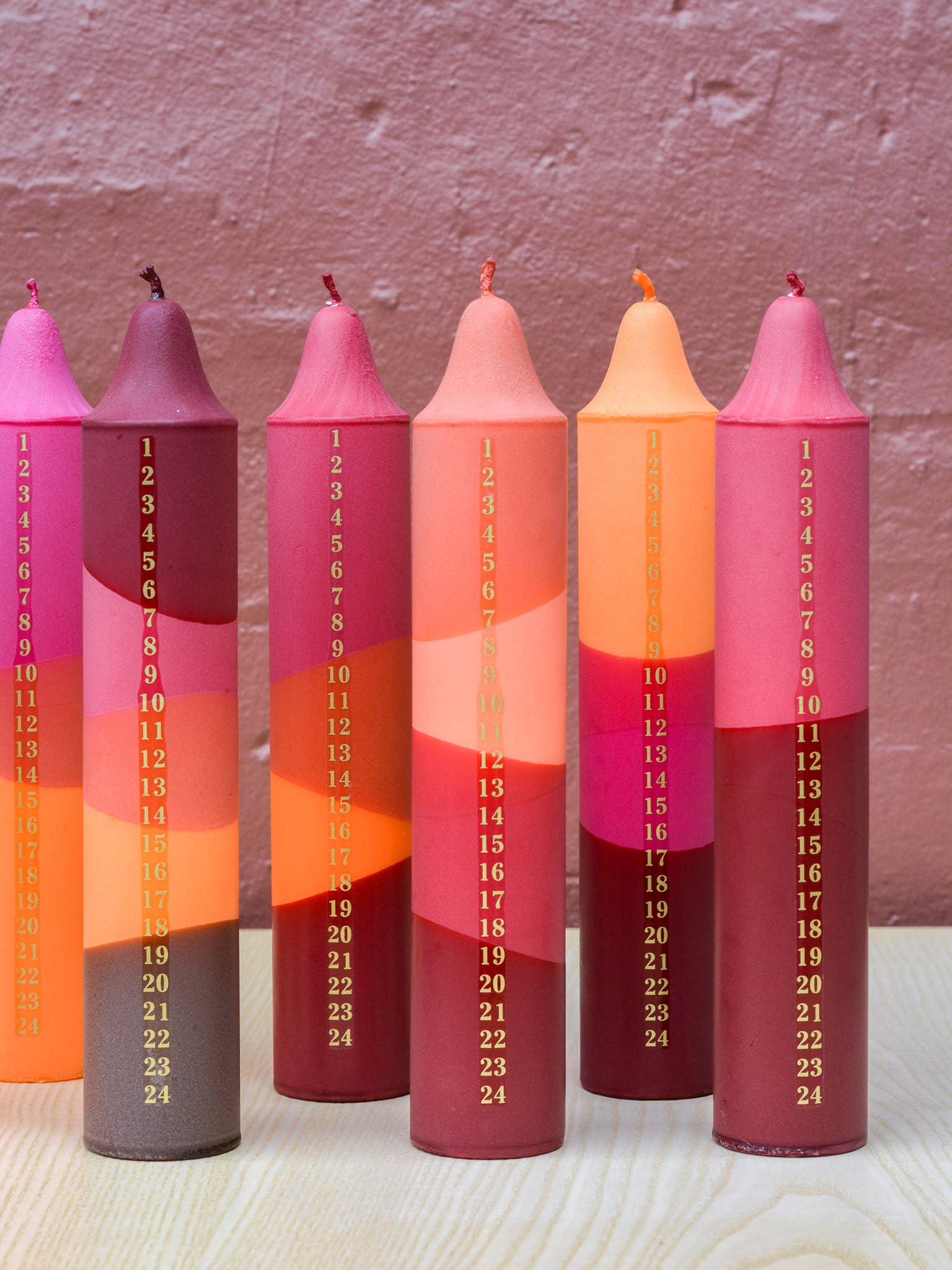 Eine skandinavische, dänische Original-Adventskerze. Jede Kerze ist mit sorgfältig markierten Zahlen versehen, die den Countdown bis Weihnachten darstellen. Es ist ein freudiges Ritual, jeden Tag eine Zahl anzuzünden, um die Aufregung und Vorfreude auf die große Feier zu steigern.