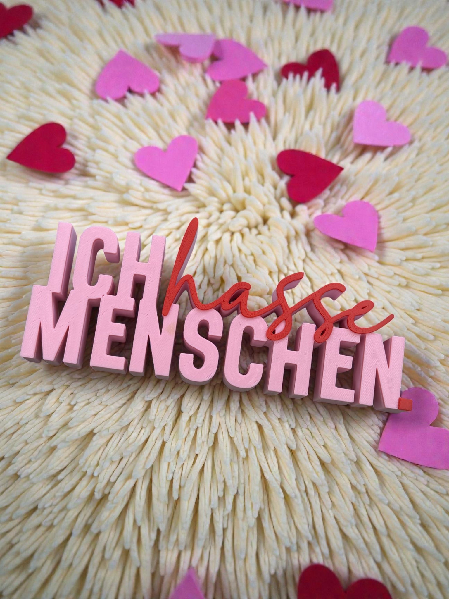 ✨ Farben: Rosa Grundton mit rotem „hasse“-Schriftzug – süß trifft Abgrund