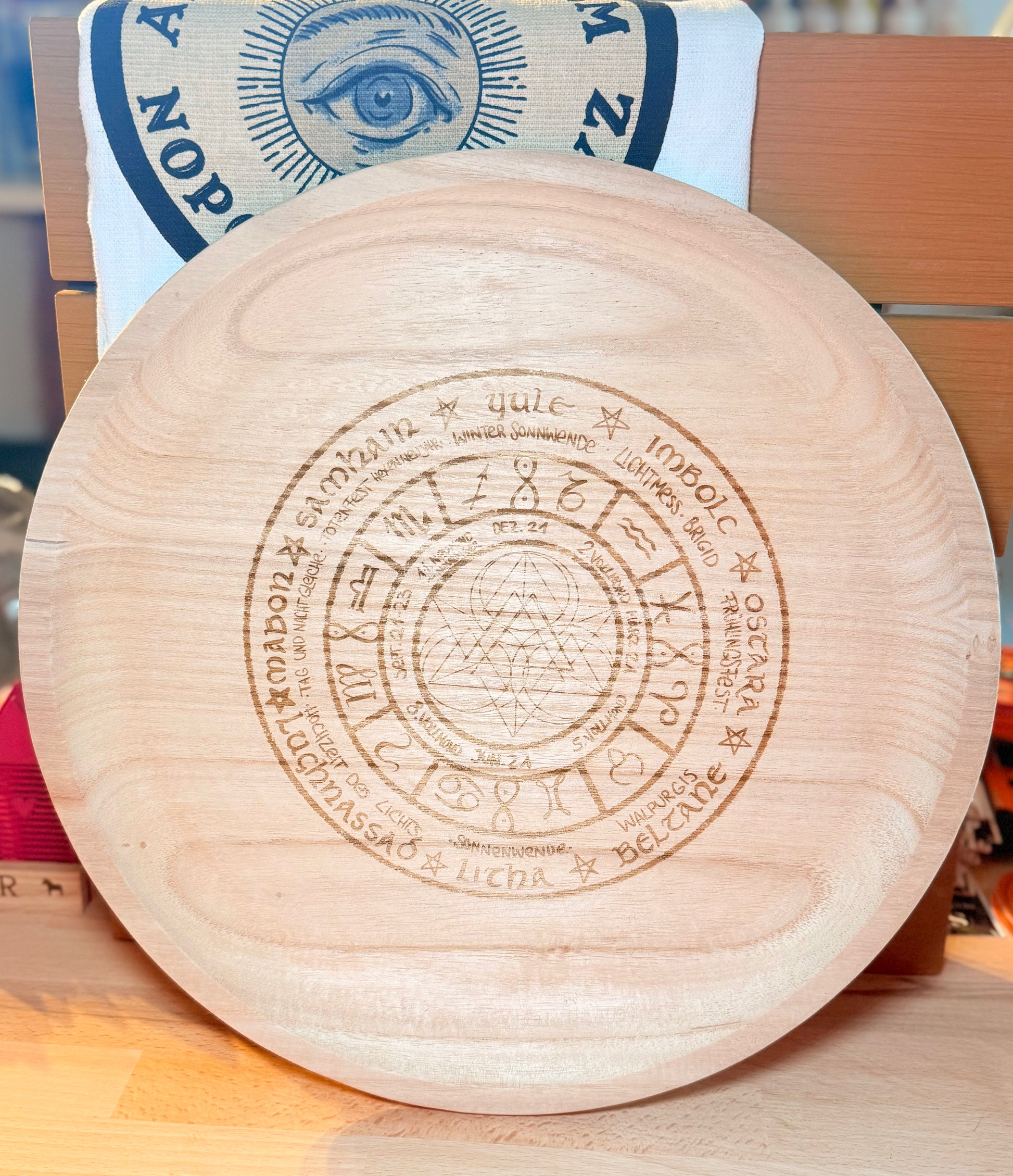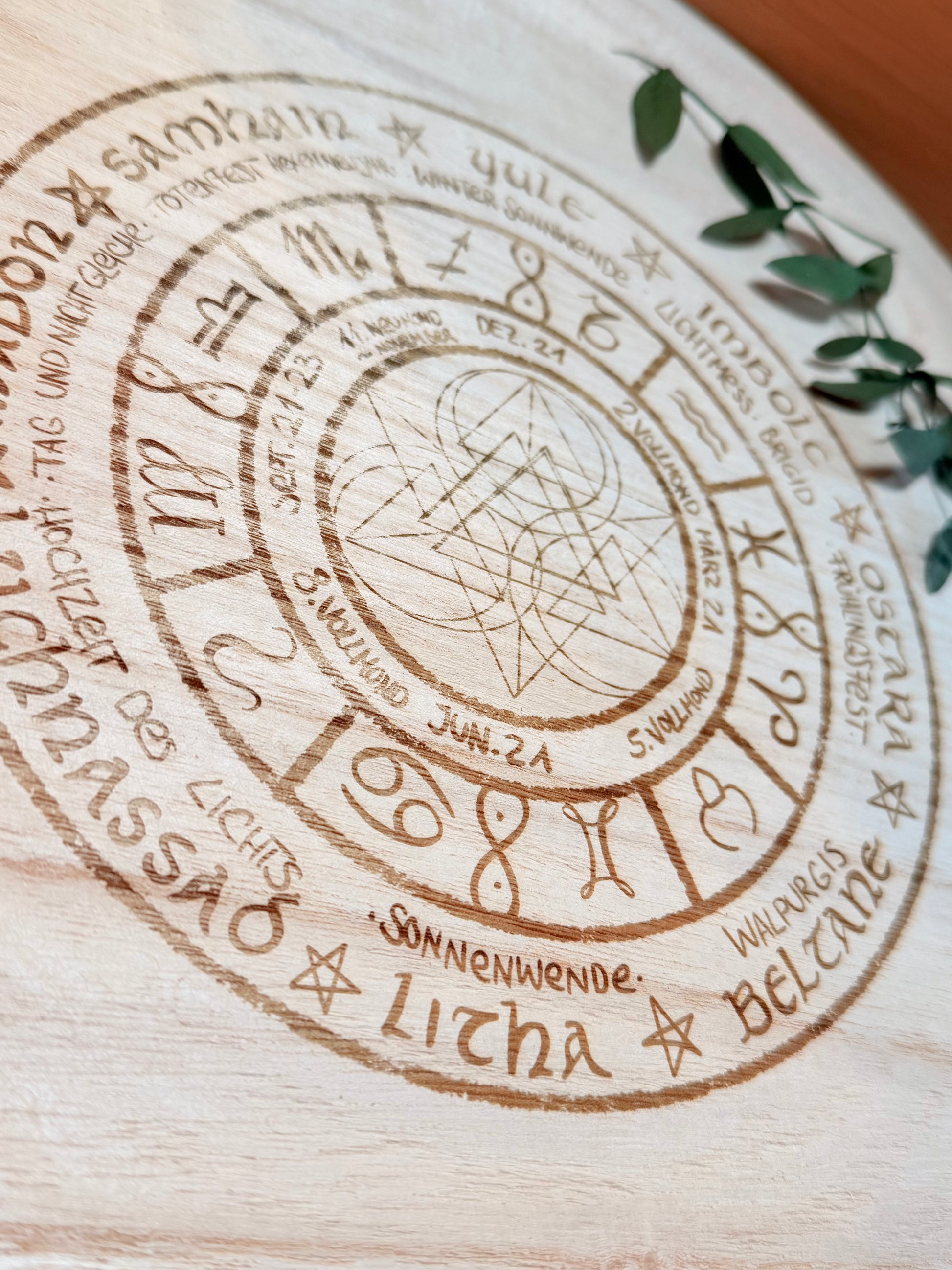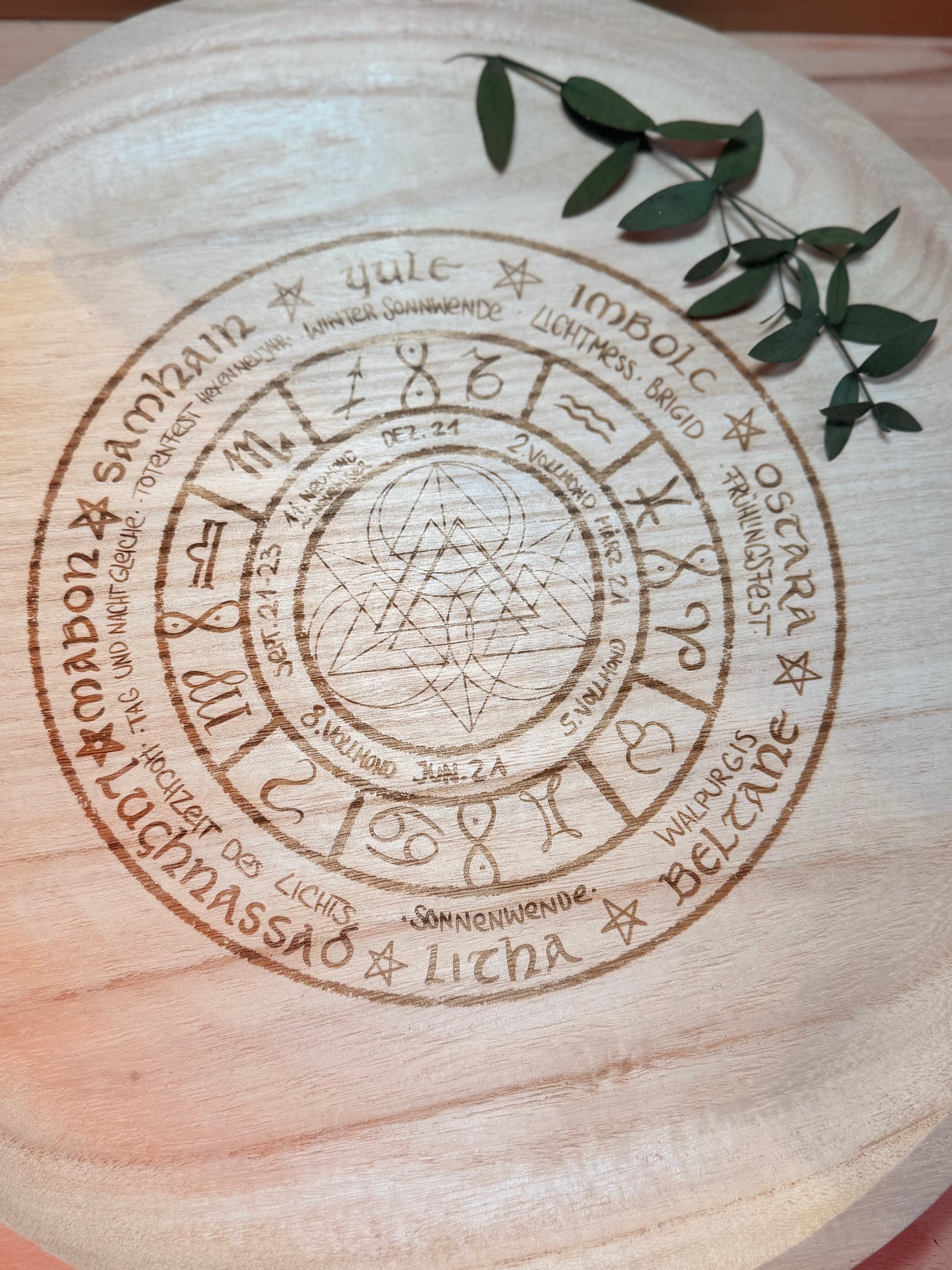 Dieses wunderschöne Tablett zeigt alle acht Jahreskreis-Feste – liebevoll illustriert mit deutschen Namen und den passenden Vollmond- oder Kalenderdaten nach uraltem Ursprung.