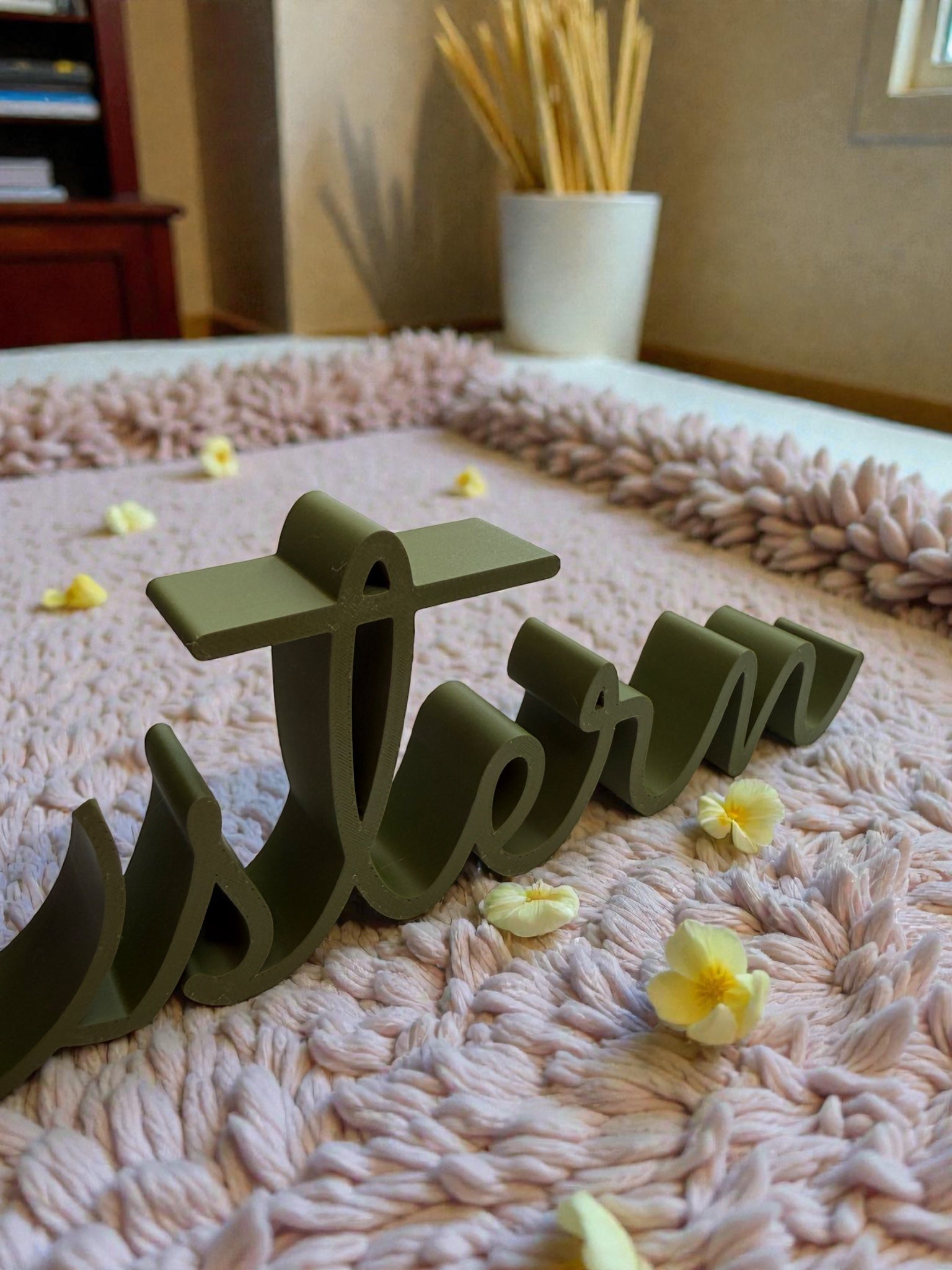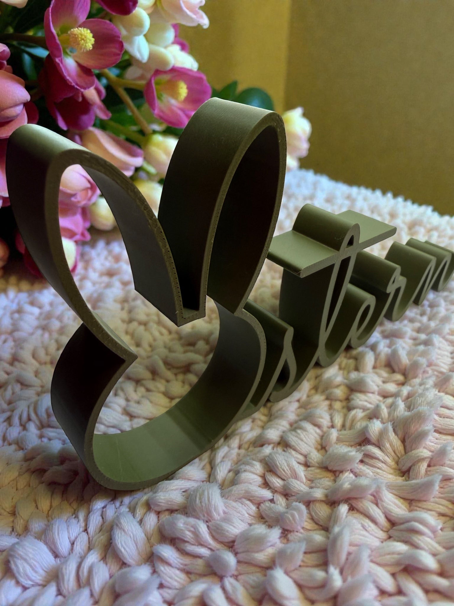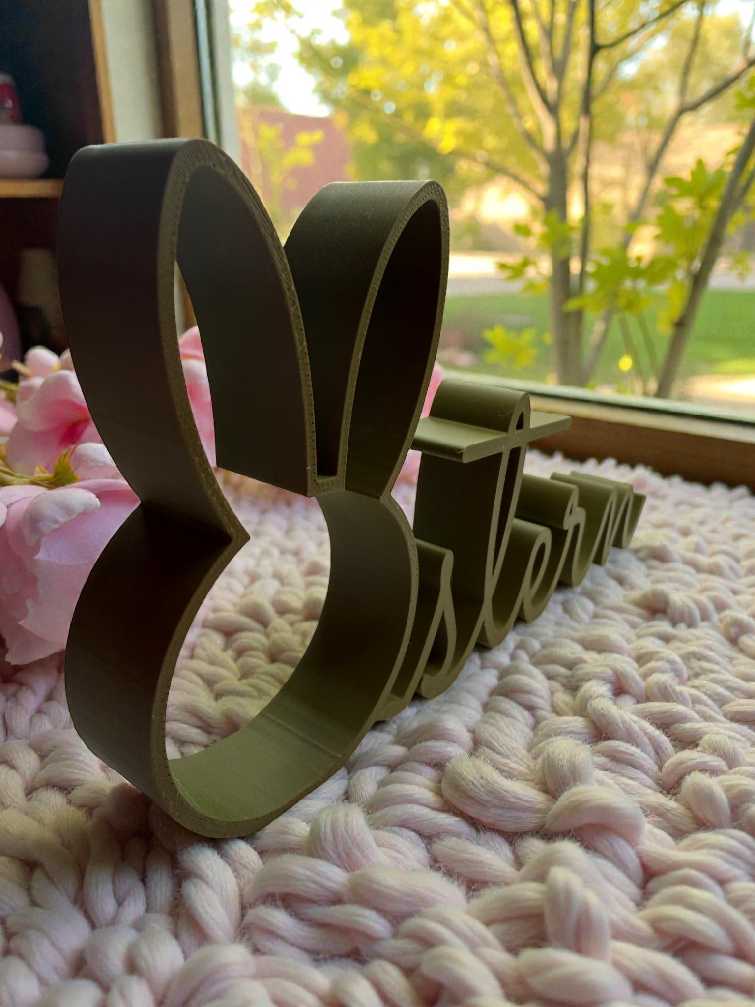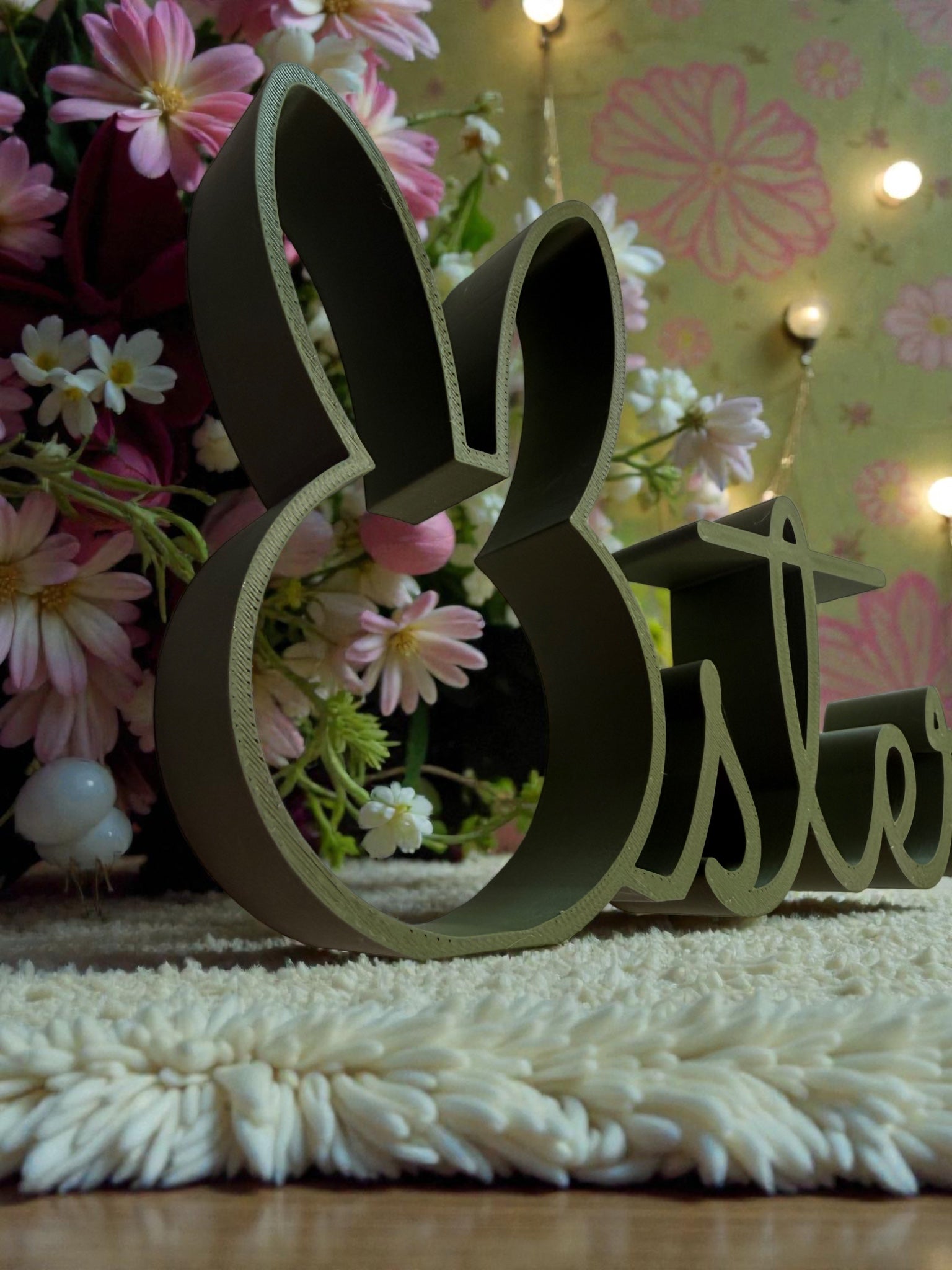 Dieser 3D-gedruckte Oster-Aufsteller bringt genau die richtige Mischung aus schlichter Eleganz und liebevollem Detail in dein Zuhause. Die weichen Formen der Hasenohren treffen auf den filigranen Schriftzug und machen ihn zu einem besonderen Blickfang auf Fensterbank, Tisch, Sideboard oder Regal.