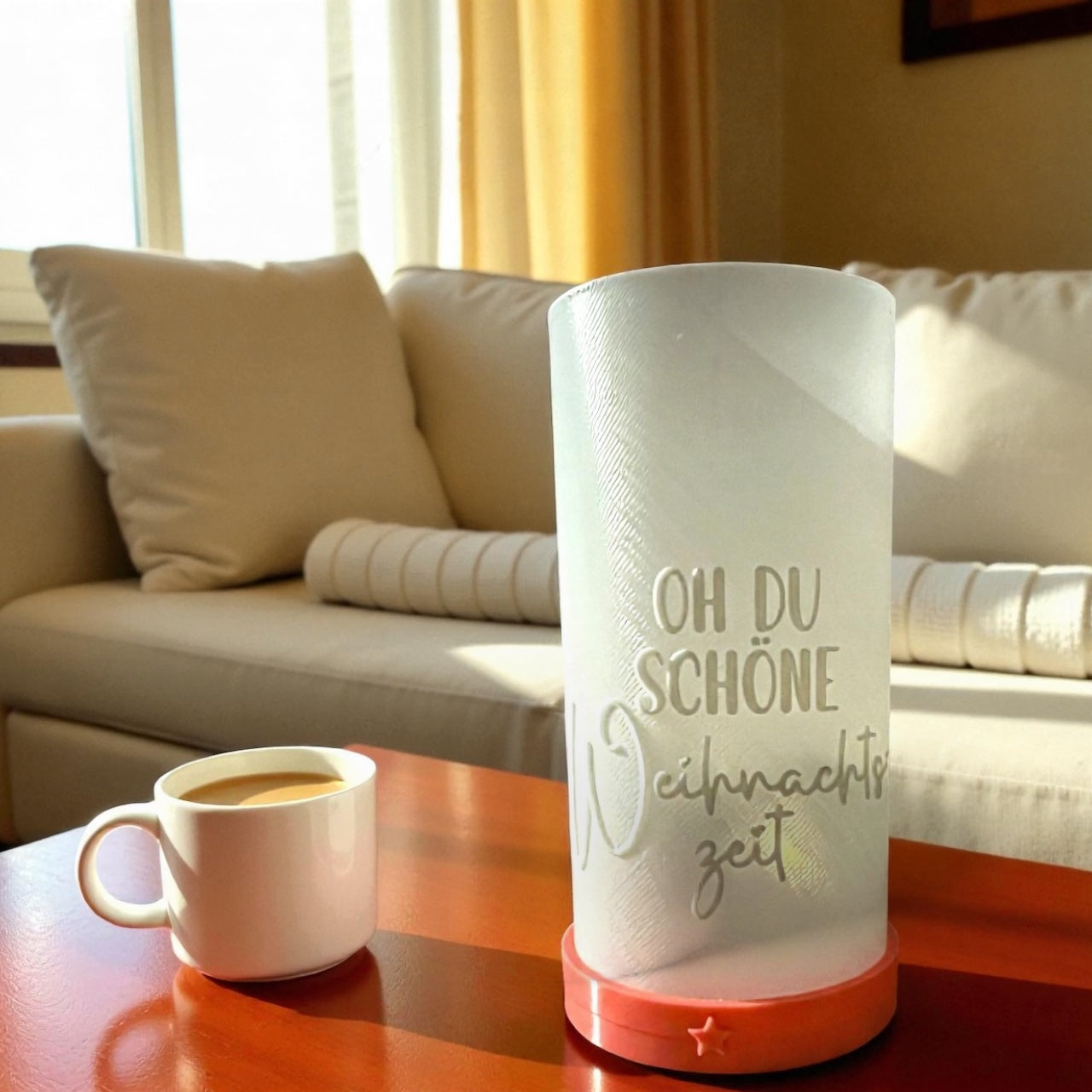 Diese 3D-gedruckten Lichtzylinder bestehen aus einer flexiblen Schablone, die hinten ganz einfach zusammengesteckt wird, und einem passenden Unterteller. In der Mitte wird ein LED-Teelicht (nicht enthalten) platziert – so entsteht ein sicherer, gemütlicher Kerzeneffekt ohne Hitzeentwicklung.